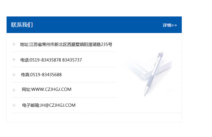 地址:常州市新北區友邦商務大廈1幢16、17層  電話:0519-85101652  傳真:0519-85112595  郵編:213022  網址:www_cz-jiayue_cn.lyf2.com  郵箱:xiajifengaa@163.com